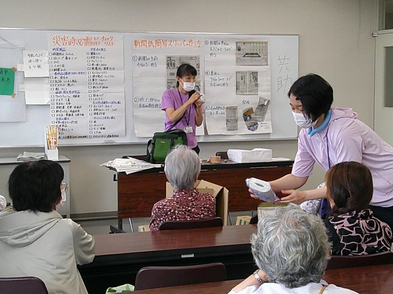 と、日頃からハザードマップで確認し意識しておくこと、また、自分や家族に合った持ち出しグッズを用意する必要性をお伝えし、避難時や、椅子などのない避難所で、床からの安楽な立ち上がり動作支援や、新聞紙とラップを使った応急処置を地域の皆さんと行いました。