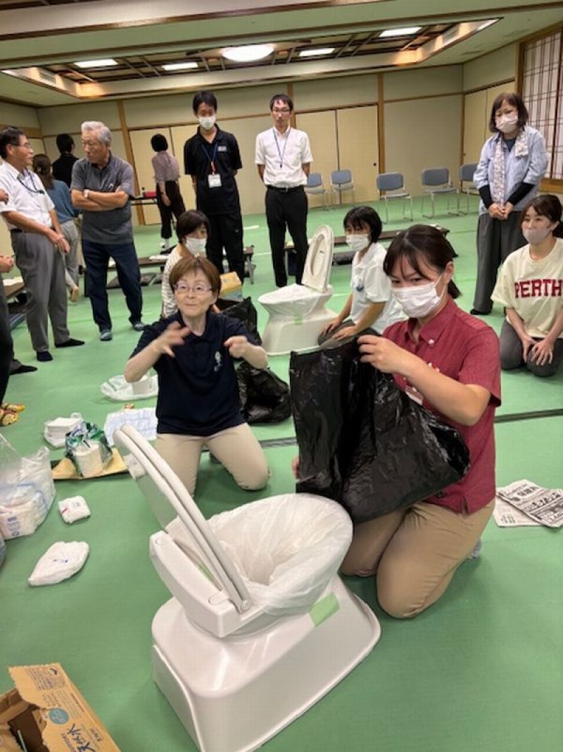 - 当日はエリア内のケアマネジャーや地域支援者、施設関係者などにお集まりいただき、非常時におけるトイレの作り方、使用方法を学びました。