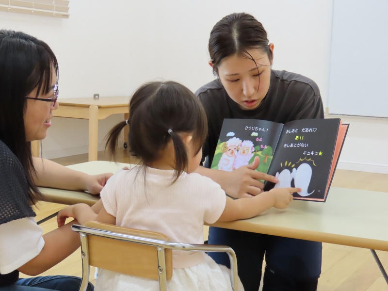 - 実際に1歳児のお子さんに療育の時間の中で読み聞かせをしました。お子さんは絵本に興味津々で目を輝かせながらながら出てくる動物を指差して絵本を楽しんでいました。たくさんのお子さんが手にして絵本を読んでいる姿もありました。素敵な絵本のご寄付をありがとうございました。