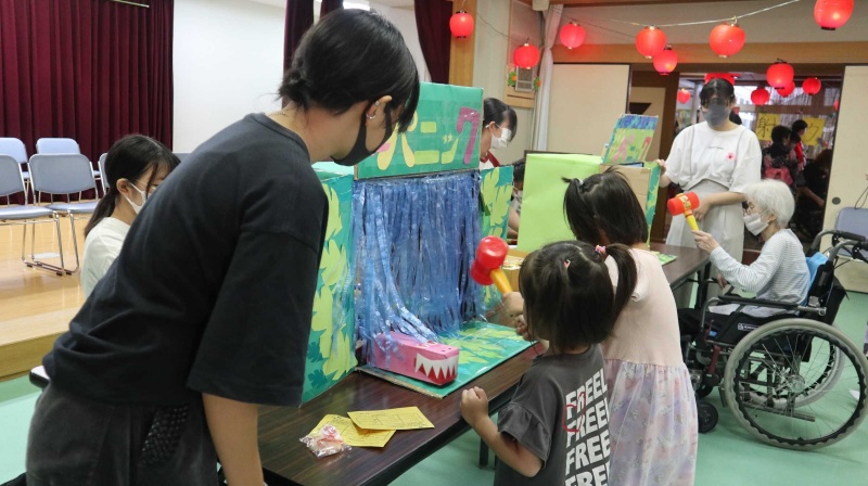 模擬店(焼きそば、フランクフルト、かき氷、ポップコーン)やアトラクション(射的、ヨーヨー釣り、ワニたたき)を行いました。