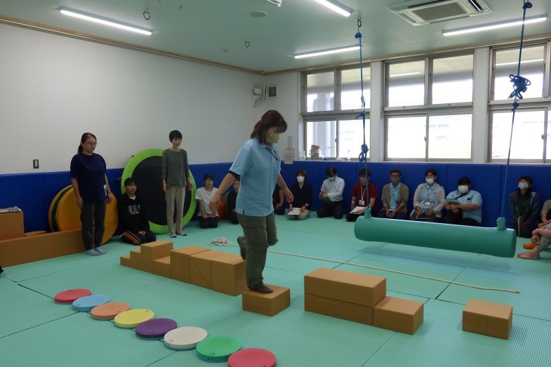 - 当日は24名が参加し、前半は体の感覚について理論を学びました。後半には、実際に遊具を使って遊び方やねらいについて理論と結びつけながら学びを深めました。実践を通して一つの遊具でも使い方の工夫で様々な遊び方やねらいを設定できることを体感できました。各事業所にある遊具や環境は異なりますが、事業所の特色を活かしながら、療育の質の向上に繋げていきたいと思います。
