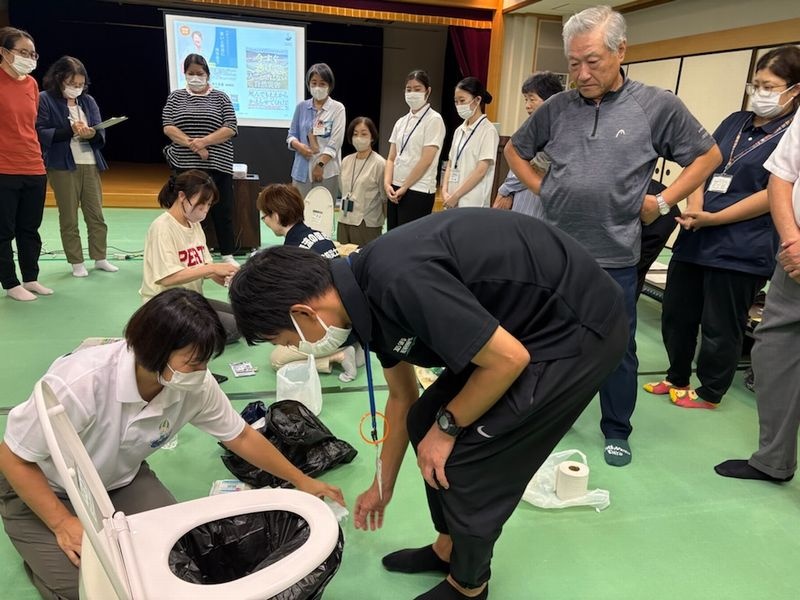 - 当日はエリア内のケアマネジャーや地域支援者、施設関係者などにお集まりいただき、非常時におけるトイレの作り方、使用方法を学びました。