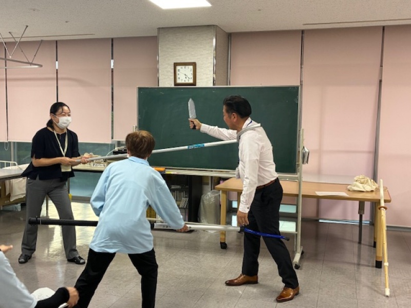 さすまたは、不審者を捕まえるだけでなく、相手を威嚇したり、警察が来るまでの時間が稼ぎのためのものであり、長さがあるため、場所によっては使いづらいこともあり、その時の対処方法も教えていただきました。