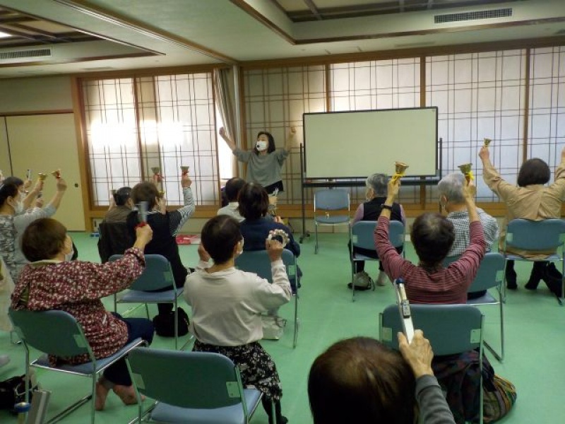 - いつものハンドベルに加え、今回は鈴、トーンチャイムの中から好きな楽器を選び、講師が「男性の方」「80歳代の方」などの声かけを行い、あてはまる時に楽器を鳴らします。皆さん、聞き逃さないようにしっかりと聞いておられました。