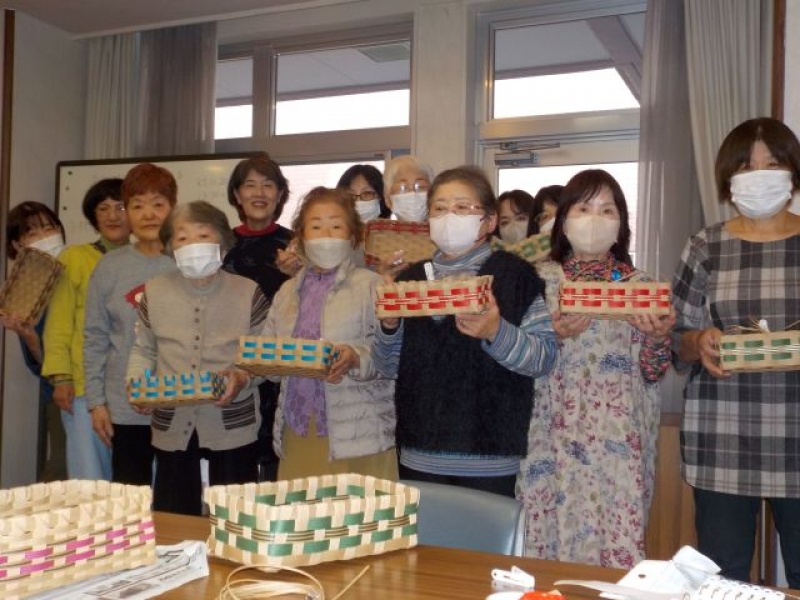 「結構、力がいるね」「間違えずに編むのは、頭をつかうね」など、参加者同士で声を掛け合い、最後にはカラフルな小物入れが出来上がりました。