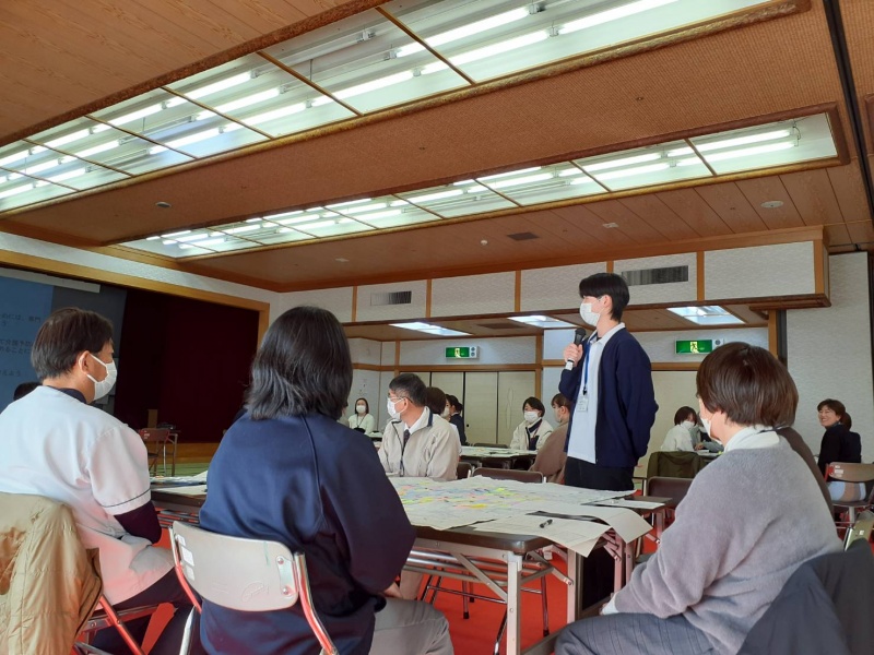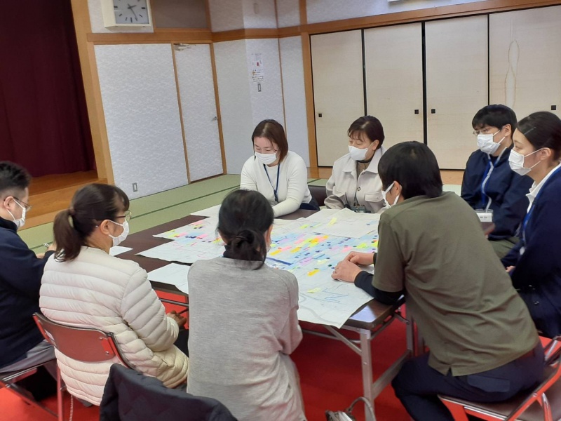 次に北エリアで計3回開催したエリア会議の振り返りをしてグループワークを行いました。今までのエリア会議で情報交換してきた社会資源について居宅介護支援事業所のケアマネージャーから通所介護サービス事業所職員に伝え、通所介護サービス事業所職員が情報を持っている社会資源を地図上に落とし込み情報交換をしました。