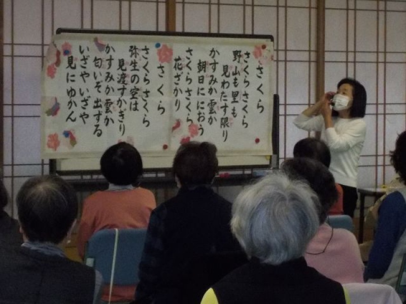 最初に季節の歌「さくら」を、お花見の名所を思い浮かべながら大きな声で歌いました。ゆっくりとした曲調は横隔膜を広げ、肺いっぱいに空気を入れてくれます。