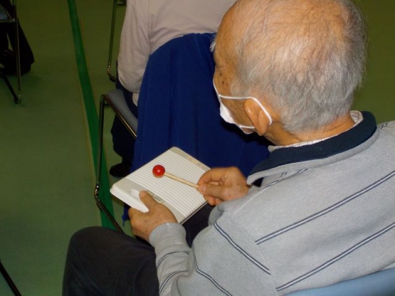 今回はいつもの鉄琴、タンバリン、鈴にミニ洗濯板を楽器に加え、唱歌や歌謡曲を歌いながら皆さんで演奏しました。